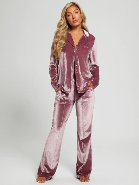 Liniștește-te Pentru Noapte în Acest Set De Pijamale Din Velur Asortat, Care Vine Cu O Cămașă Cu Mânecă Lungă, Cu închidere Cu Nasturi în Față și Un Logo Brodat Plus Pantaloni Elastici.