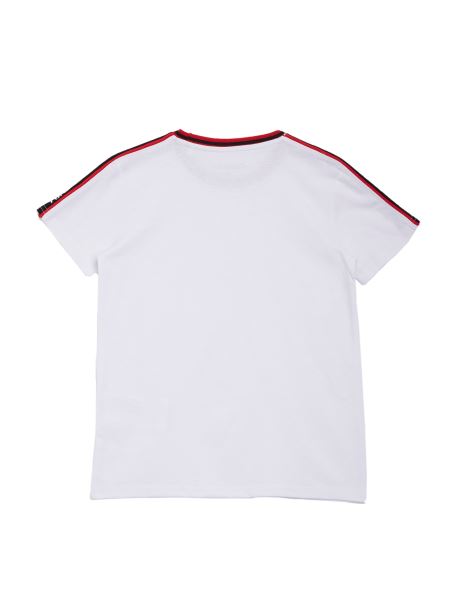 O Cămașă Nouă Pe Care O Poate Pune în Rotație. Acest Tricou Din Tricou Are Un Decolteu Cu Dungi Cu Vârf, Umeri Cu Bandă Cu Logo și Mâneci Scurte.