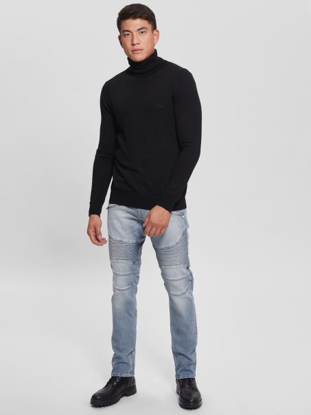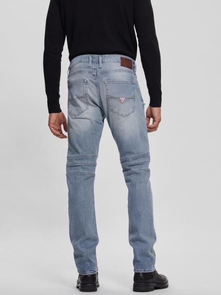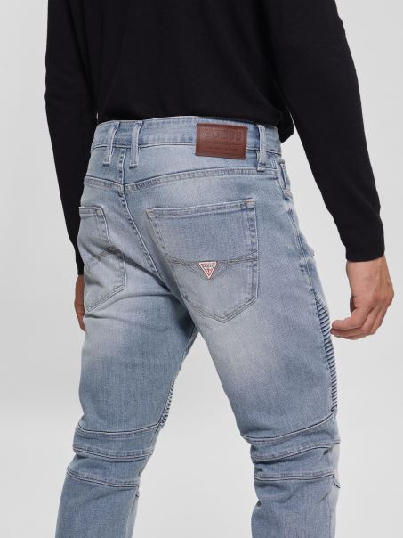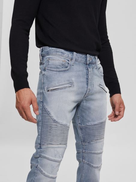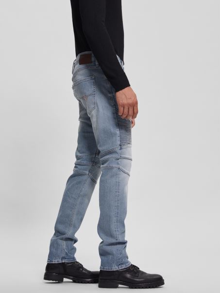 îmbunătățește-ți Aspectul Cu Acești Blugi Subțiri Conici, Cu Cusături Moto Strânse și Ușoare învechite La Genunchi. Finisat Cu Buzunare Frontale Cu Fermoar.