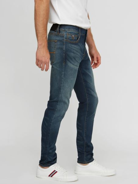O Pereche De Blugi Din Tricot De Culoare închisă, Cu O Potrivire Skinny Modernă, Mustață Ușoară și șlefuire Manuală Pentru Un Aspect Mai Viu. Construcția Moale, Super Elastică Din Denim Oferă Confort Pe Tot Parcursul Zilei.