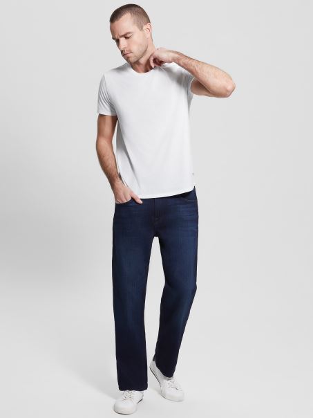 Pentru Confortul De Zi Cu Zi. O Pereche De Blugi De Lux Cu O Mână Moale Prezintă O Decolorare Subtilă, Mustață în Față și O Potrivire Relaxată.