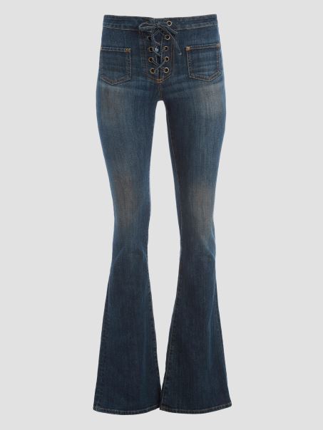 Aduceți O Nouă Dimensiune Colecției Dvs. De Denim Cu Acești Blugi Cu Talie înaltă, Care Au O închidere Neașteptată Cu șireturi, Buzunare Cu Plasture Duble în Față și în Spate și Un Picior Evazat Dramatic.