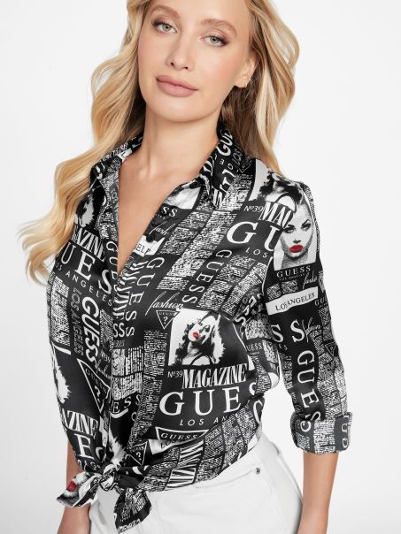 Proiectat într-o Fabricație Ușoară, Acest Top Cu Mânecă Lungă Are Un Imprimeu Inspirat De Ziar și Este Decorat Cu Guler Pliat și închidere Cu Nasturi în Față.