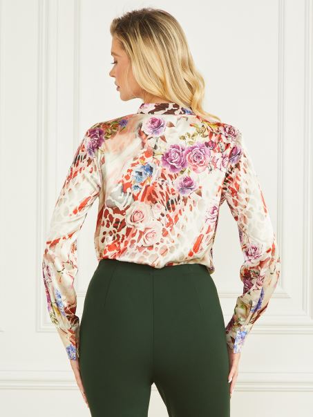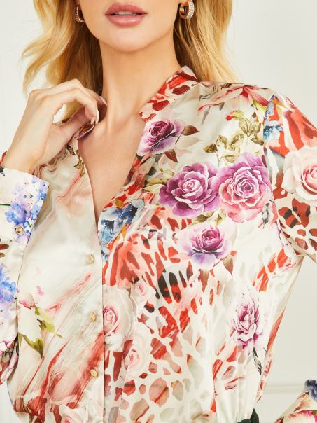 Florele Fanteziste Se Combină Cu Un Imprimeu Animal Feroce Pentru A Alcătui Această Bluză Charmeuse Captivantă, Cu Un Decolteu în V Cu Guler în Picioare, Mâneci Lungi, Manșete Cu Nasturi și închidere Cu Nasturi în Față Cu Monogramă.