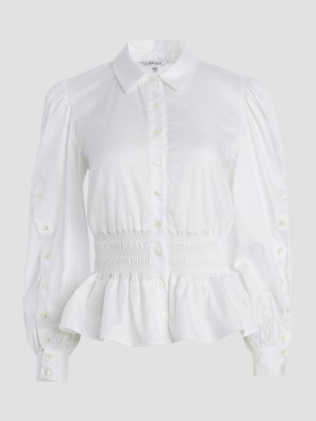 Eleganță Feminină Dintr-o Singură Piesă, Această Bluză Drăguță Are Guler Ascuțit, Mâneci Lungi Umflate, Cu Umerii încrețiți și Talie Smock Cu Tiv Pliat Peplum.