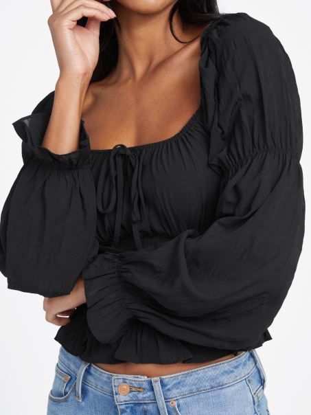 Un Favorit Feminin, Acest Top Aeris Are Un Decolteu Pătrat Cu Detaliu De Cravată în Centru, Mâneci Lungi Umflate, Cu Piese Elastice și O Talie Smocked, Cu Tiv De Jos Cu Volane Cochet.