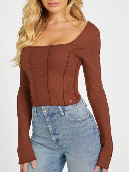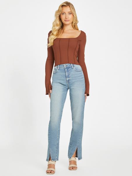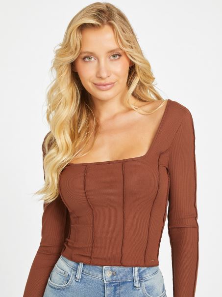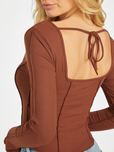 Pur și Simplu O Necesitate, Acest Top Actualizat Este Realizat într-o Fabricație Din Tricot în Coastă, Evidențiată Cu Cusături Expuse Peste Tot. Are Un Decolteu Pătrat, Mâneci Lungi Cu Manșete Evazate și Un Detaliu Decupat La Spate Cu închidere Cu Cravată. Contine Plastic Reciclat.