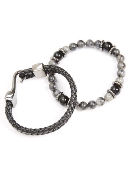 set De Două Brățări Cu Un Design Gri Marmorat și Mărgele și O Brățară Cu Cârlig împletită Din Piele Artificială