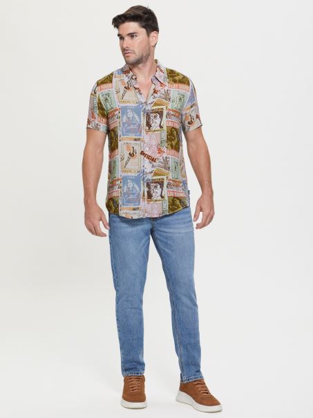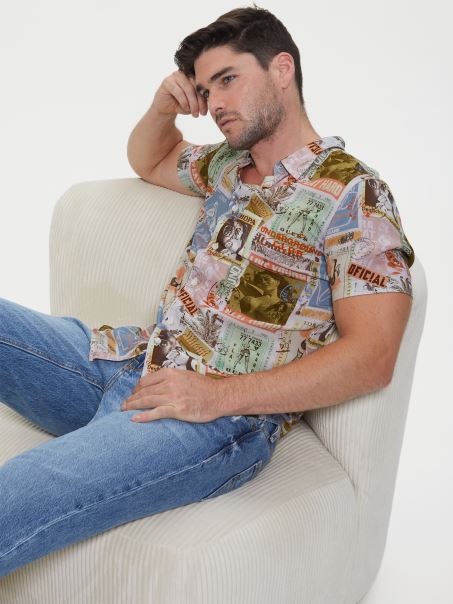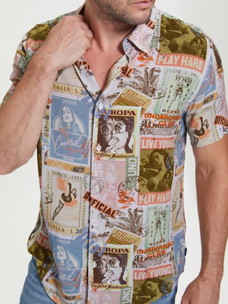 Aventurează-te în Această Cămașă țesătă Challis, Cu Imprimeu Colorat De Cărți Poștale, Guler Pliat, Mâneci Scurte și Tiv. închidere Cu Nasturi. Fibre Regenerabile, Pe Bază De Lemn.