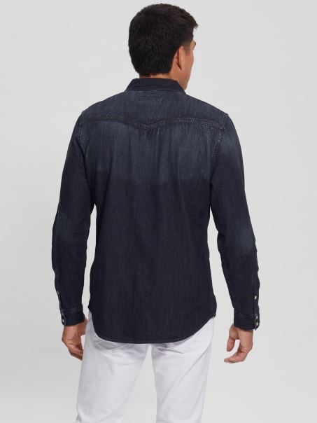 Pentru Bărbatul Modern, O Cămașă Din Denim De Culoare închisă, Cu O Croială Obișnuită, Cu Jug Vestic, Guler Pliat, Mâneci Lungi, Tiv Cu Coada Cămășii, Buzunare Cu Clapă Pe Piept, închidere Cu Apăsare și Curăță în Față.