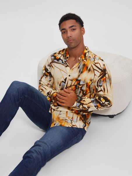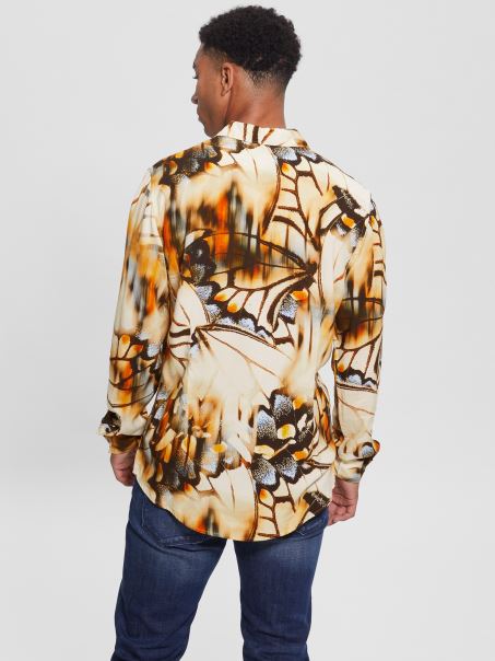 Această Cămașă Are Un Imprimeu Fluture Peste Tot Cu Contururi Moi, Un Guler Pliat, Mâneci Lungi și Un Tiv Cu Coada Cămășii. închidere Cu Nasturi. Conține Fibre Biodegradabile Pe Bază De Lemn.