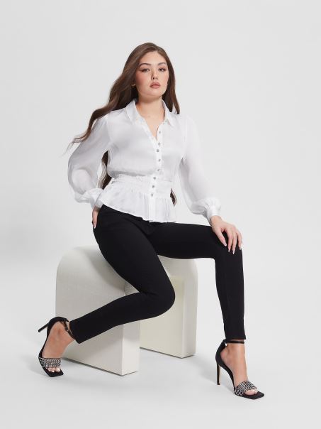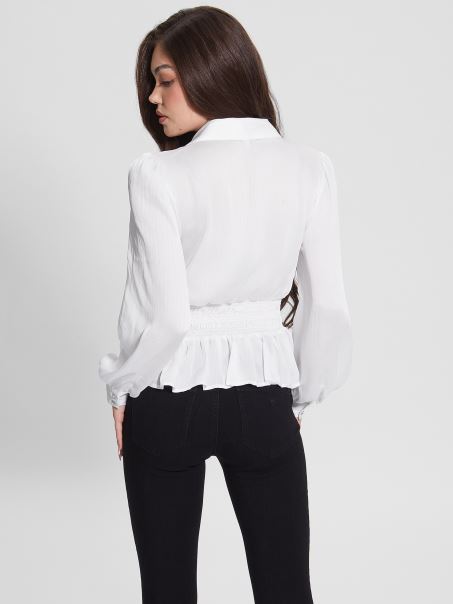 Nasturi Eleganti Din Cristal Acoperă Această Cămașă șifonată, Cu Decolteu în V, Cu Guler îndoit, Talie Cu Fumuri, Mâneci Lungi Cu Balon, Tiv Peplum și închidere Cu Nasturi în Față. Opțiunea Albă Este Semitransparentă. Realizat Cu Sticle Reciclate.