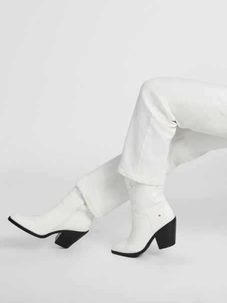 Pentru Următoarea Ta Excursie în Vest, O Pereche De Cizme Inspirate De Cowgirl Din Piele Artificială, Care Au Un Panou Din Piele De Căprioară Artificială, Bretele De Tragere, Un Vârf Ascuțit, Toc Stivuit și Fermoar Lateral.