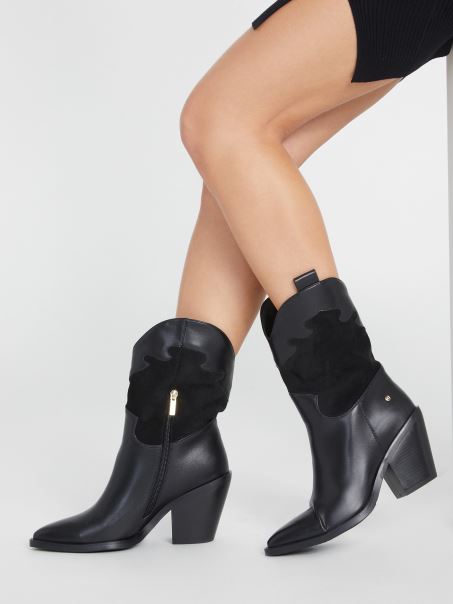 Pentru Următoarea Ta Excursie în Vest, O Pereche De Cizme Inspirate De Cowgirl Din Piele Artificială, Care Au Un Panou Din Piele De Căprioară Artificială, Bretele De Tragere, Un Vârf Ascuțit, Toc Stivuit și Fermoar Lateral.