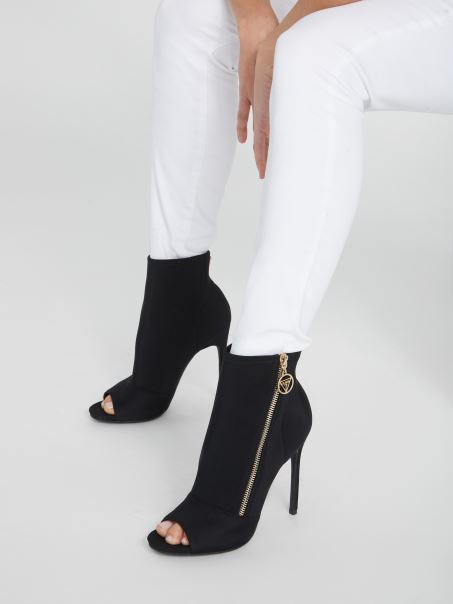 Ridică-ți Ansamblul Cu Acești Papuci Drăguți, Proiectați într-o Fabricație Luxoasă Din Tricot Elastic, Cu Un Vârf Deschis și Toc Stiletto. Inchidere Cu Fermoar Lateral Cu Clapeta De Tragere Cu Logo.
