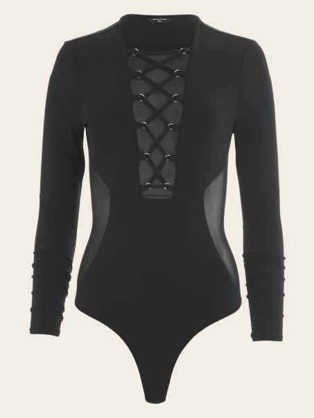 Inserțiile Sufocante Din Plasă Transparentă Evidențiază Acest Body Din Tricot Crepon, Cu Decolteu Cu șireturi, Mâneci Lungi, Potrivire Tanga și închidere Cu Nasturi.