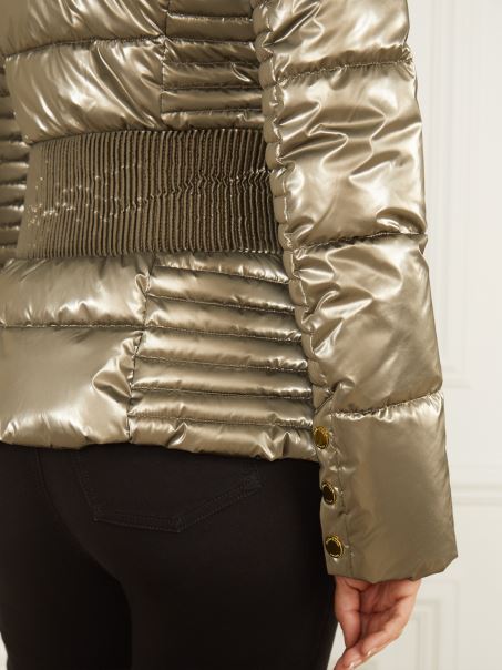 îmbracă-ți Aspectul Cu Această Jachetă Puf Din Imitație De Piele Elegantă, Cu Un Design Matlasat, Guler Larg Pliat, Talie Cu Fumuri, Mâneci Lungi Cu Nasturi, Buzunare Cu Fermoar Căptușite Cu Polar și închidere Cu Fermoar.