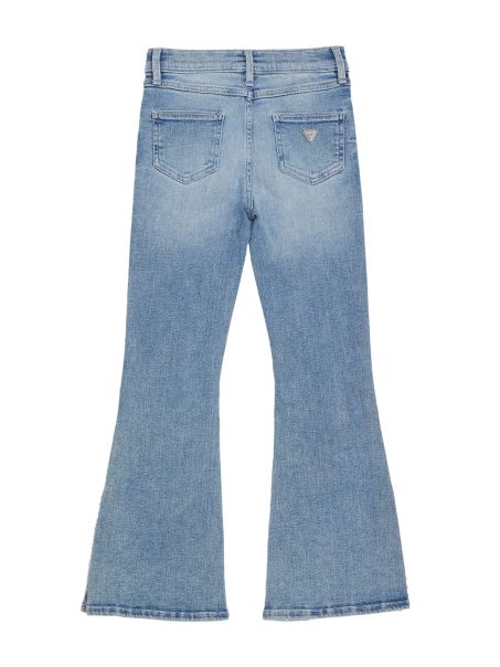 Ea Va Străluci și Va Străluci în Acești Blugi Evazați, Cu Un Tiv Despicat Cu Accente De Strass, Decolorați și Mustăți. Denim Cu Spalare Medie, Cu Design Cu Patru Buzunare și închidere Cu Fermoar.