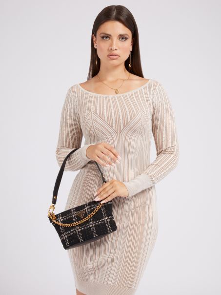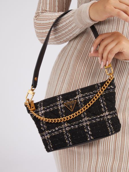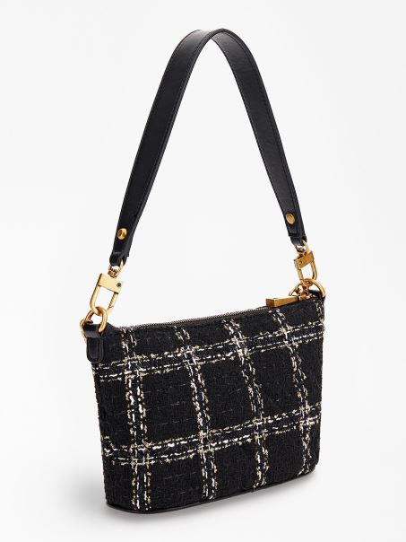 Geantă Neagră Guess Cessily Tweed Mini Găleată