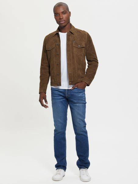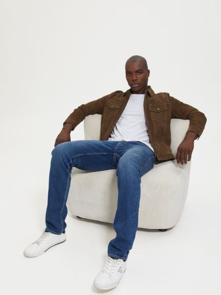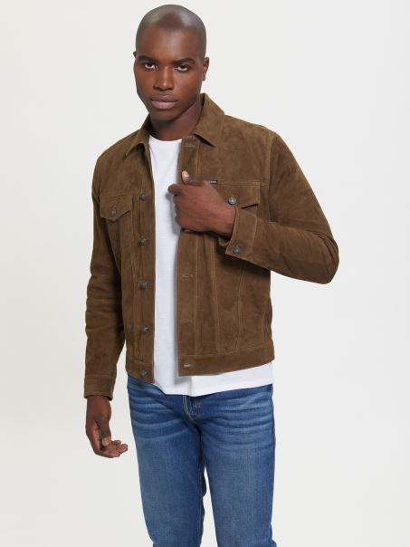 O Jachetă Clasică în Stil Camioner, îmbunătățită în Piele De Piele Naturală și Căptușeală Jacquard. Complet Cu Un Guler Clasic Pliat, închidere Cu Nasturi Frontale și Buzunare Duble La Piept.
