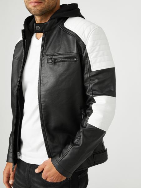 Termină-ți ținută Cu This Jachetă De Motociclist Din Piele Artificială, Cu Căptușeală Matlasată De Culoare Bloc De-a Lungul Mânecilor Lungi și O Inserție Detașabilă Din Bumbac Din Jerseu Cu Glugă. Buzunar Cu Fermoar La Piept și închidere Cu Fermoar în Față.
