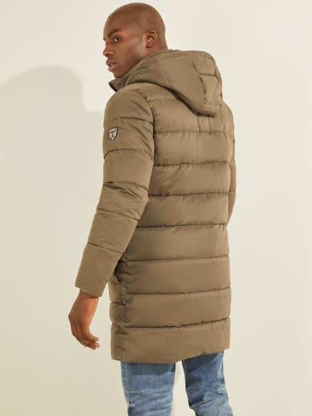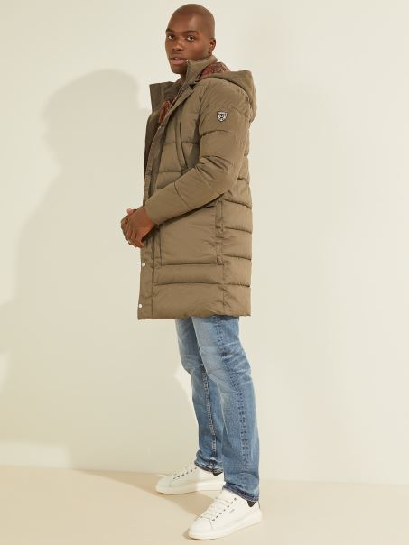 O Jachetă Din Nailon Rezistentă La Vânt și La Apă, Cu Lungime Medie, Are O Construcție Matlasată Pentru Un Plus De Căldură, O Glugă Detașabilă Cu Căptușeală Imprimată, Buzunare Frontale și O închidere Cu Fermoar Cu Capse.