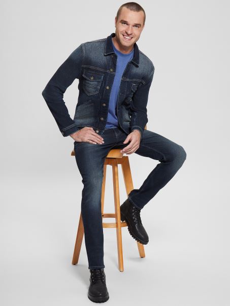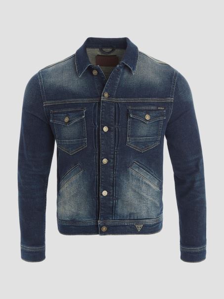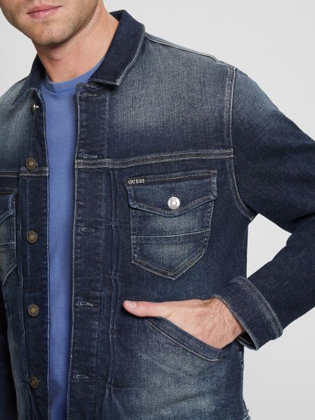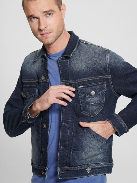 Acest Stil Iconic Primește Un Upgrade. Jachetă Din Denim închis La Culoare, Cu Decolorare Puternică, Guler Pliat, Buzunare Frontale, Mâneci Lungi și închidere Cu Nasturi. Realizate Din Plastic Reciclat.