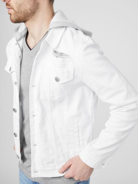 Adaugă Un Finisaj Clasic Look-ului Tău Cu Această Jachetă Din Denim, Cu Glugă Detașabilă Din Tricot, închidere Cu Nasturi în Față și Buzunare înclinate în Față. Detalii învechite, Buzunare Plasate în Față și Guler Ascuțit.
