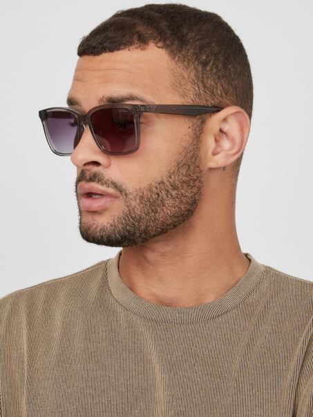 îndreptați-vă Spre Razele Soarelui în Acești Ochelari De Soare Pătrați Cu Aspect Ascuțit, Cu O Ramă De Plastic, Lentile Colorate și Logo-uri Triunghiulare La Tâmple.