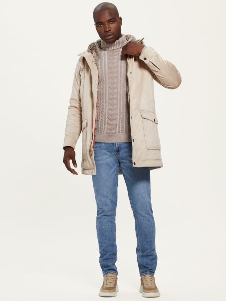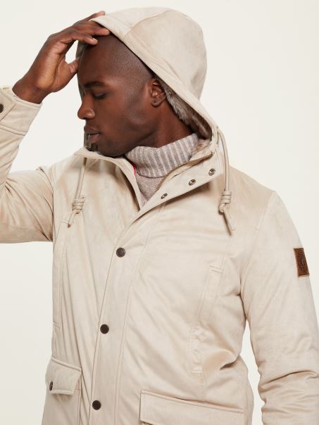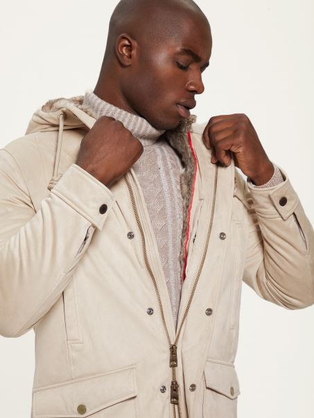 Concepută într-o Fabricație Din Piele De Căprioară Artificială Periată, Cu Căptușeală Caldă Din Piele Sintetică, Această Haină Este Esențială Pentru Vremea Rece. Are O Glugă Atașată Cu șnururi, Fermoar Frontal și Buzunare Cu Clapă Pliabile și O închidere Frontală Cu Fermoar.