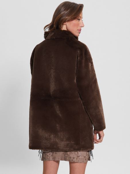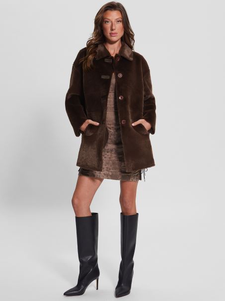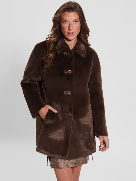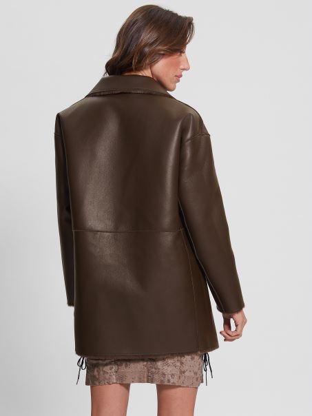 Aveți Opțiuni Cu Această Haină Inventive, Cu Părți Laterale Reversibile Din Piele Artificială și Blană Artificială. Cu Guler Pliat, Buzunare Laterale și închidere Cu Nasturi Frontale.