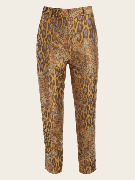 Un Adaos Magistral. Acest Pantalon țesut Are Un Design Jacquard Paisley și Leopard, Buzunare înclinate, Cusături Presate Prințesă, Crop Crop și închidere Cu Fermoar Lateral.