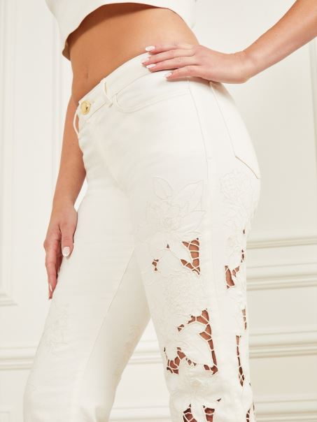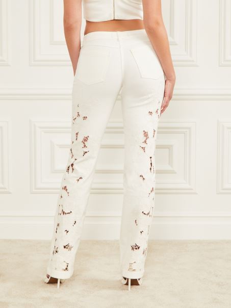 Feminin și Cochet, Acest Pantalon Din Denim Prezintă Ornamente Florale Cu Un Design Decupat și Un Picior Drept.