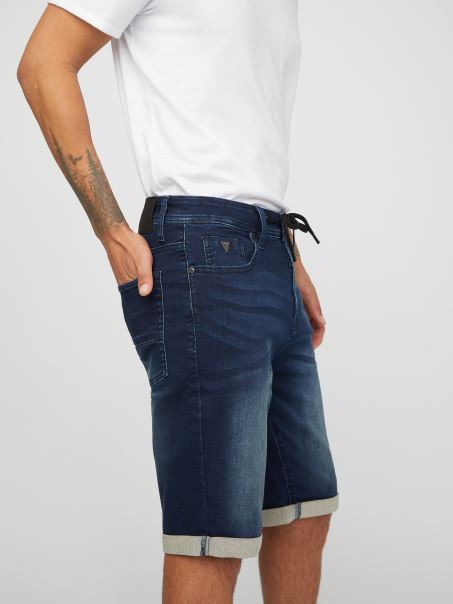 Talie Cu șnur și Manșete Rulate Definesc Acești Pantaloni Scurți Din Denim, Cu Mustăți și Design Cu Cinci Buzunare.