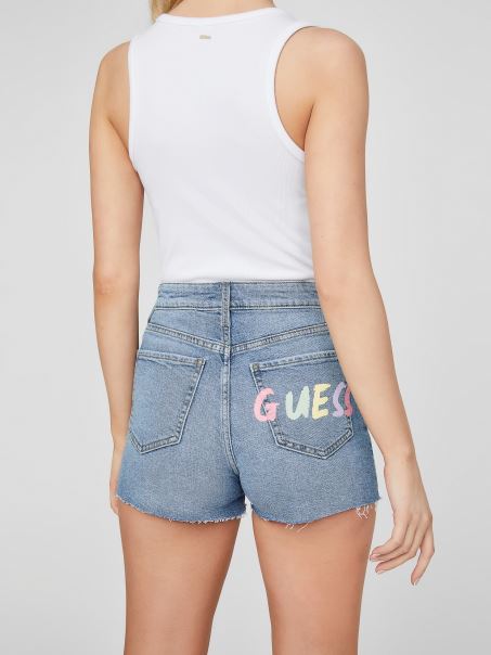 Găsește-ți Cele Mai Lungi Picioare Cu Acești Pantaloni Scurți Cu Talie Mare, Cu Text Cu Logo Pictat în Spate și Tiv Brut. Realizat Cu Fibre De Bumbac Reciclate.
