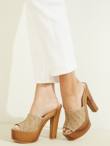 Faceți O Declarație Cu Aceste Tocuri Atrăgătoare, Cu Un Vamp Moale, Cu Un Model De Logo Accentuat De Strasuri și Un Vârf Deschis. Terminat De O Platformă și Toc Din Lemn Neașteptate.