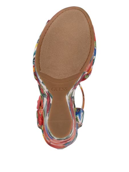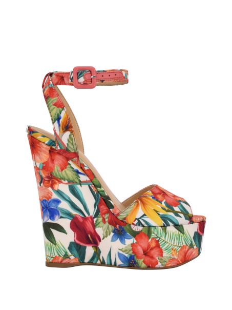 Adaugă O Ediție îndrăzneață Look-ului Tău Cu Aceste Tocuri Cu Pană Cu Imprimeu Floral Tropical, Curea Reglabilă La Gleznă, Platformă și Vârf Deschis.
