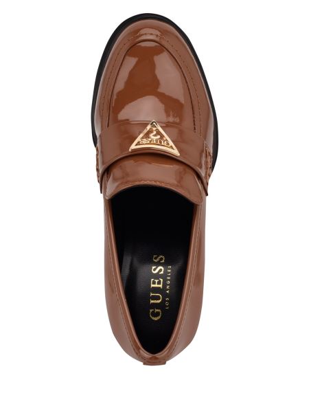 O Pereche îmbrăcată Cu Fler De Inspirație Vintage. Mocasini Din Imitație De Piele Confecționați Cu Vârf De Migdale, Toc Bloc, Talpă Groasă și Emblemă Cu Logo Triunghi.