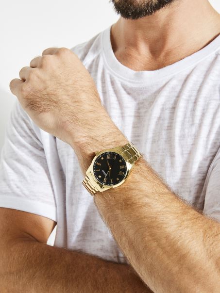 Du-ți Stilul La Noi Niveluri Cu Acest Ceas Clasic Analog Auriu, Complet Cu Un Cadran Negru. Ornamente Cu Diamante Autentice.