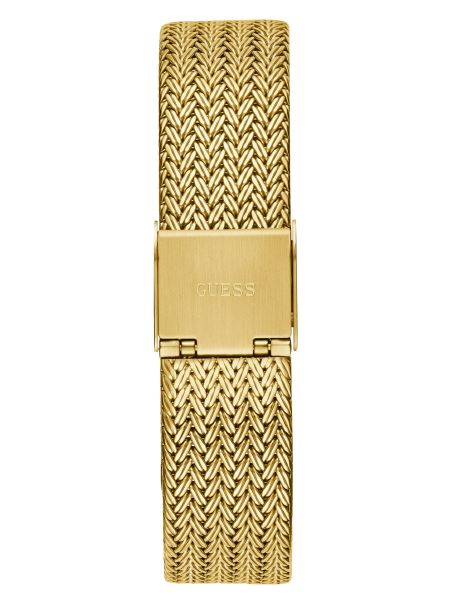 O Piesă De Finisare Elegantă. Acest Ceas Analogic Auriu Are O Lunetă încrustată Cu Baghete, O Față încrustată Cu Cristale și O Bandă Din Plasă Lustruită.