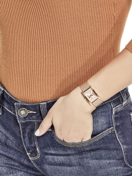 Acest Ceas De Culoare Auriu Roz Are Un Cadran Dreptunghiular și Ornamente Cu Strasuri Cu O Bandă De Plasă.