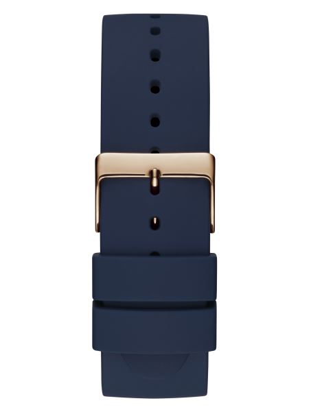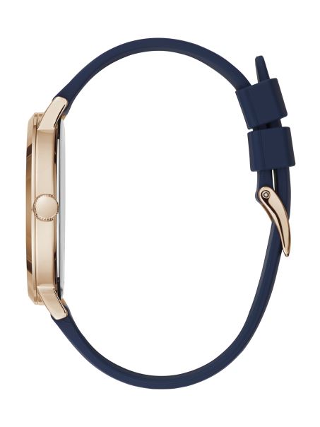 Rămâneți Elegant Cu Acest Ceas Analogic în Nuanță De Aur Roz, Cu O Curea Din Silicon Bleumarin, Detaliu Cu Logo și Carcasă Asortată în Nuanță De Aur Roz.