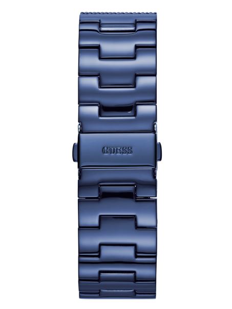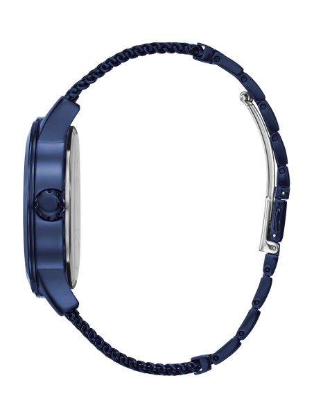 Un Ceas Modern Cu O Siluetă Clasică. Acest Ceas Analogic Are Un Design Minimalist, Complet Albastru, Cu O Curea Din Plasă, Marcatori De Cristal și Detalii De Logo.