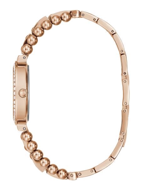 Notă Finală A Aspectului Tău Formal, Acest Ceas Auriu Roz Se Mândrește Cu Un Design Complex De Brățară Cu Conexiuni Bile și Strasuri. Completat De Accente De Strass In Jurul Cadranului Analogic Argintiu, Cu Hartie Sclipitoare Si Marcatoare Cu Cifrele 12 Si 6 Ore.