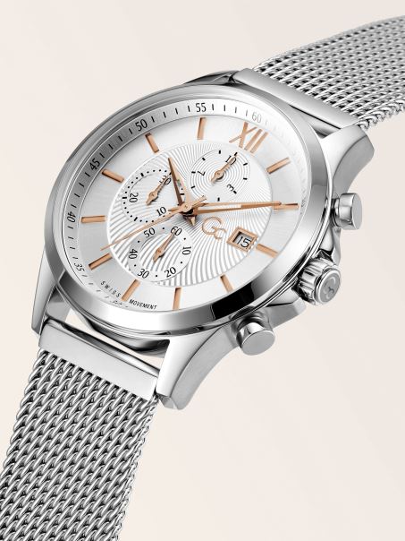 y27004fmswcadoptă Un Aspect De Eleganță Clasică Cu O Notă La Modă. Liniile Pure Ale Acestui Cronograf Pentru Bărbați, în Totalitate Argintie, Se Combină Cu Cadranul Argintiu Ghilochᄄᆭ Pe O Brățără Elegantă și Contemporană Cu Plasă Argintiecel Mai Bun Dintre Precizia Elvețiană și Stilul Francez: Toate Ceasurile Sunt Gc Caracterizate Printr-un Aspect Excepțional. Mișcare De Calitate și Design Unic.versiunea Argintie: