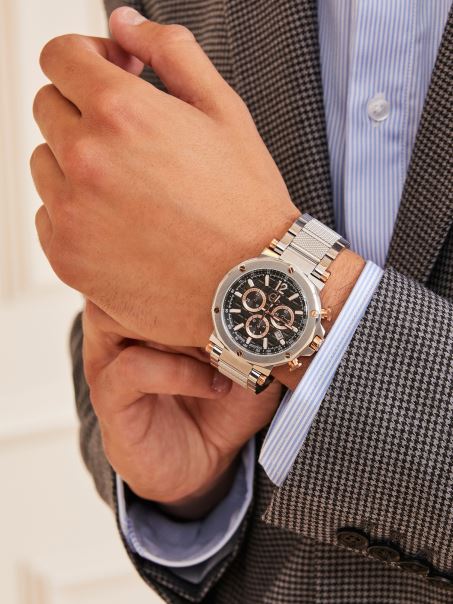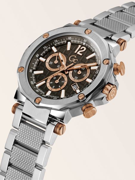 valorificați Spiritul Gc Cu Acest Cronograf Foarte Detaliat în Tonuri Argintii Cu Cadran Negru Ghilochᄄᆭ Marcat De Accente De Aur Roz, Oferind Un Aspect Distinct și O Siluetă Izbitor De Masculină Pe Brățără Cu Linkuri De Culoare Argintie Cu Accente Pvd Auriu Roz
