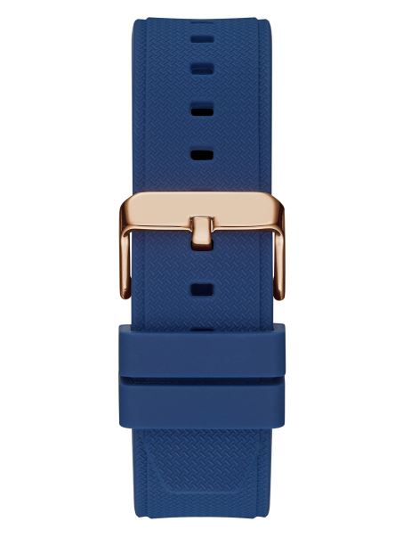 Atunci Când Schimbați Treptele, Atingeți Acest Ceas Auriu Roz, Cu Accesorii Expuse Pe O Carcasă Albastră, Cadrane Multifuncționale și O Bandă De Silicon în Albastru.
