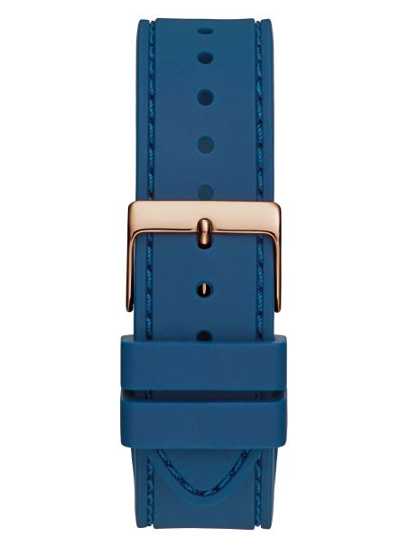 Ridică-ți Ceasul De Zi Cu Zi Cu Acest Ceas Uimitor Cu Accente De Cristal Pe Carcasa Auriu Roz și Pe Cadranul Multifuncțional Plin De Farmec, Cu Cadrane Duble și Indici Minimaliste. Finisat De O Curea Confortabilă Din Silicon Albastră.