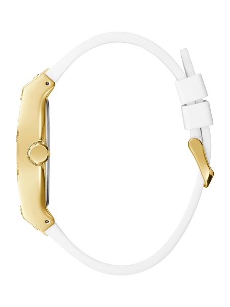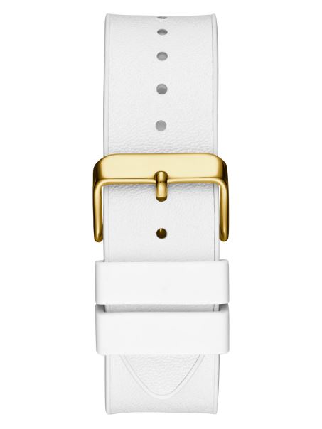 O Piesă De Management Al Timpului Care Va Atrage Atenția. Acest Ceas Are Un Urec Dreptunghiular Auriu, Cadrane Multifuncționale și O Bandă Albă Din Piele Naturală și Silicon.