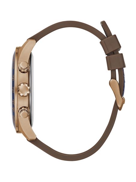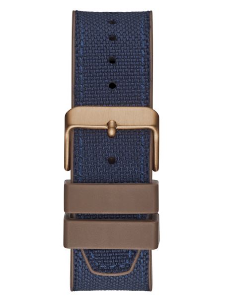 Un Ceas Multifuncțional Atrăgător, Care Prezintă O Carcasă Auriu Roz, Cu O Lunetă și Cadran Albastru. Prezentând O Combinație Confortabilă De Pânză Albastră Lipită De O Curea Din Silicon Maro.